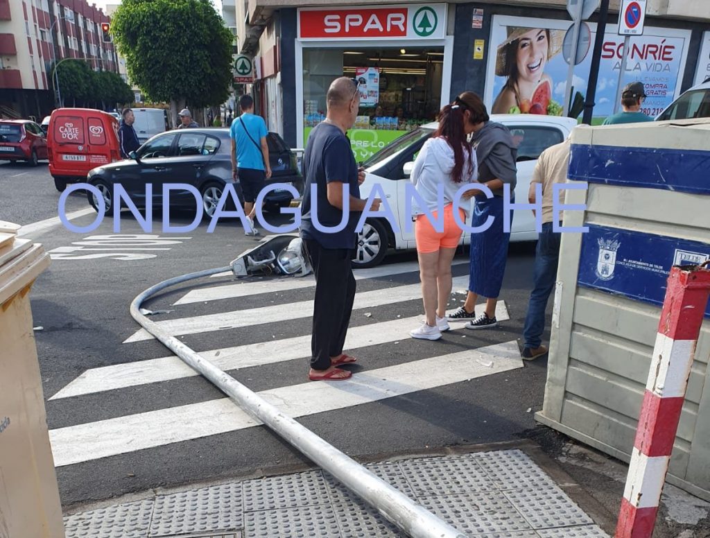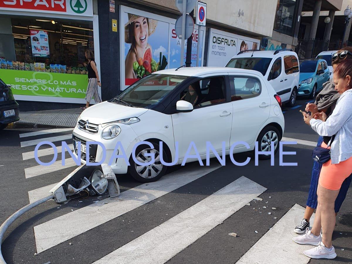 Según acaba de conocer ONDAGUANCHE, una farola situada en la acera colindante con la estación de servicio Shell Telde (frente al Teatro Juan Ramón Jiménez), se acaba de caer sobre el capó de un coche que circulaba por la calle Poeta Pablo Neruda, justo a la altura del paso de peatón existente al final de esta vía. La conductora del vehículo tuvo que ser asistida por un ataque de ansiedad.