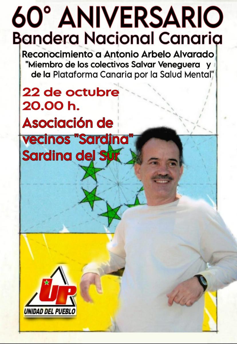 El próximo martes día 22 de octubre de 2024, a las 20:00 horas, en la Asociación de Vecinos de Sardina, de la localidad de Sardina del Sur, del término municipal de Santa Lucía de Tirajana, se realizará un evento, dentro de los actos de la celebración del Día de la Bandera Nacional Canaria, concretamente se conmemora su 60 aniversario, con un reconocimiento especial a título póstumo a Antonio Arbelo Alvarado (1962-2023), que entre otra facetas fue Funcionario de Correos y del Instituto Nacional de la Seguridad Social, portero de fútbol del equipo de su pueblo, Doctoral, del Club Deportivo San Pedro Mártir, Portavoz de la Plataforma Canaria por la Salud Mental y Militante y fundador destacado del Colectivo Ecologista ·Salvar Veneguera”.