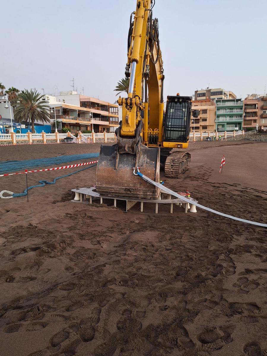 Las tareas conllevan un amplio despliegue que en la costa teldense, concretamente en la playa de Salinetas, cuyos vecinos se han visto sorprendidos hoy por la cercanía del barco desde el que se enganchará la canalización con el cable central.